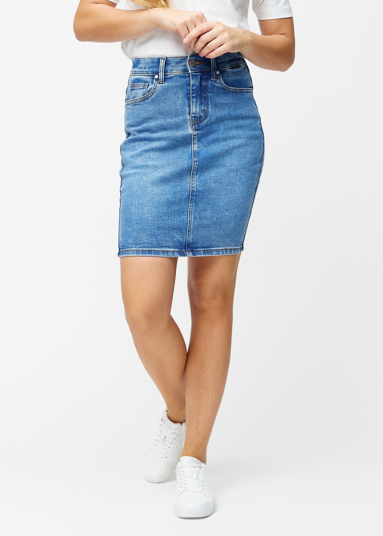 Fuldt billede af model i klassisk blå, tætsiddende og knælang denimnederdel.