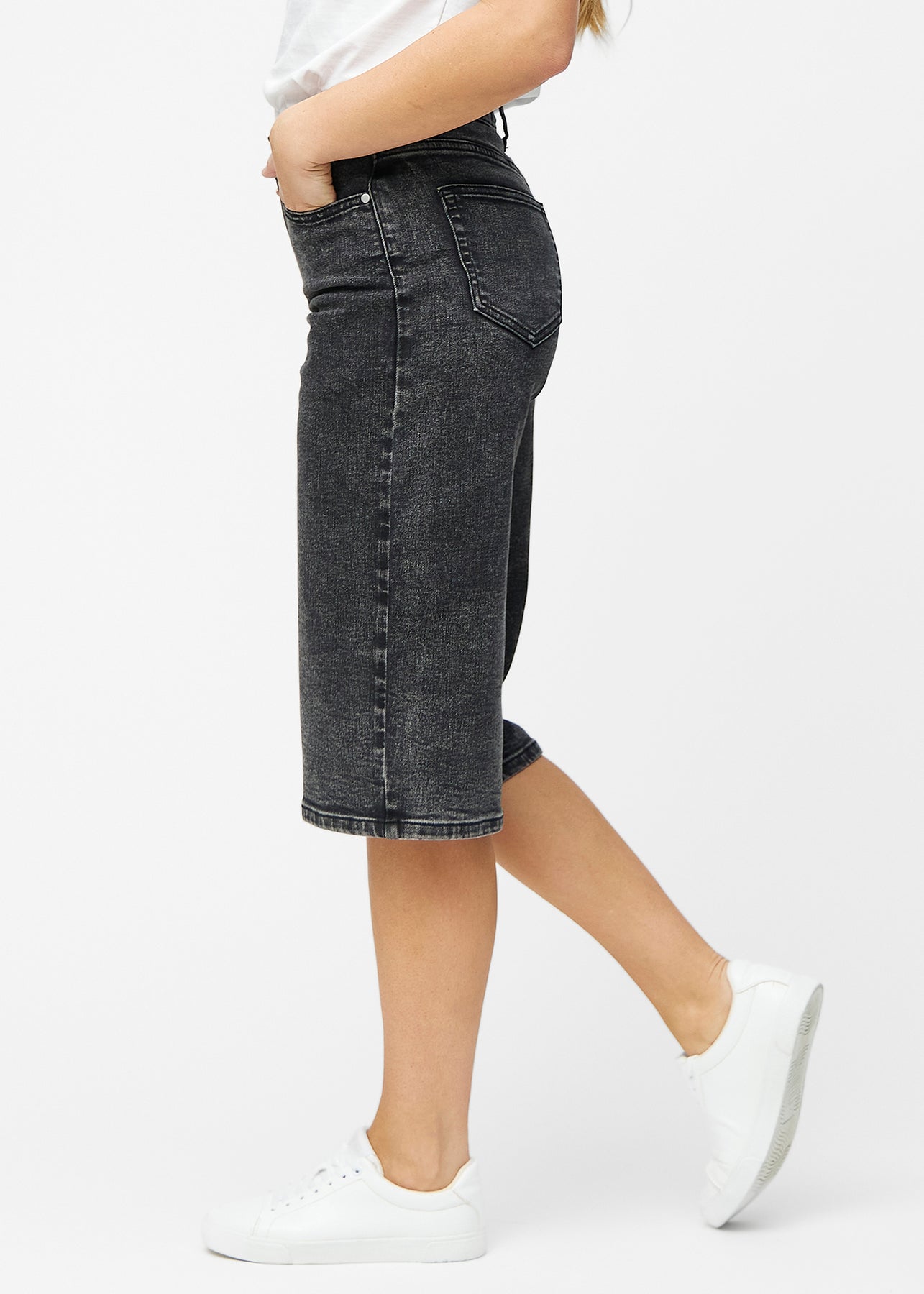 Løse, mørkegrå denim capris i farven Shadows set fra siden på model, hvor den brede pasform og længden til lige under knæet er synlig.