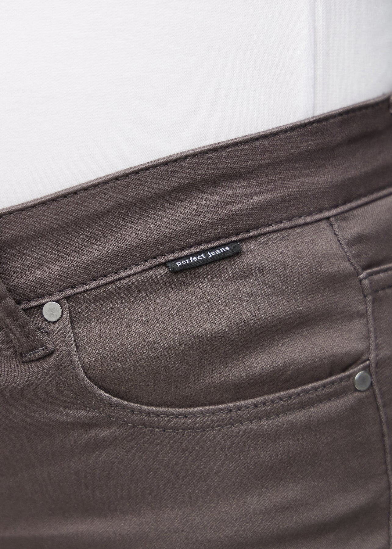 Nærbillede af gråbrunt jeansmateriale med Perfect Jeans logoetiket ved forlommekanten.